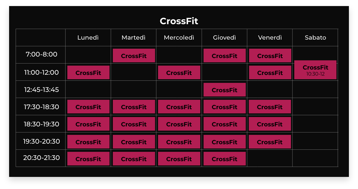 Dalle 7 di mattina alle 9.30 di sera, gli orari di CrossFit Sempione sono pensati per consentirti di frequentare senza alcuna limitazione ogni singola classe della giornata negli orari stabiliti dal palinsesto. In alternativa, è possibile concordare con un membro dello staff una lezione personalizzata nell’orario più adatto a te.